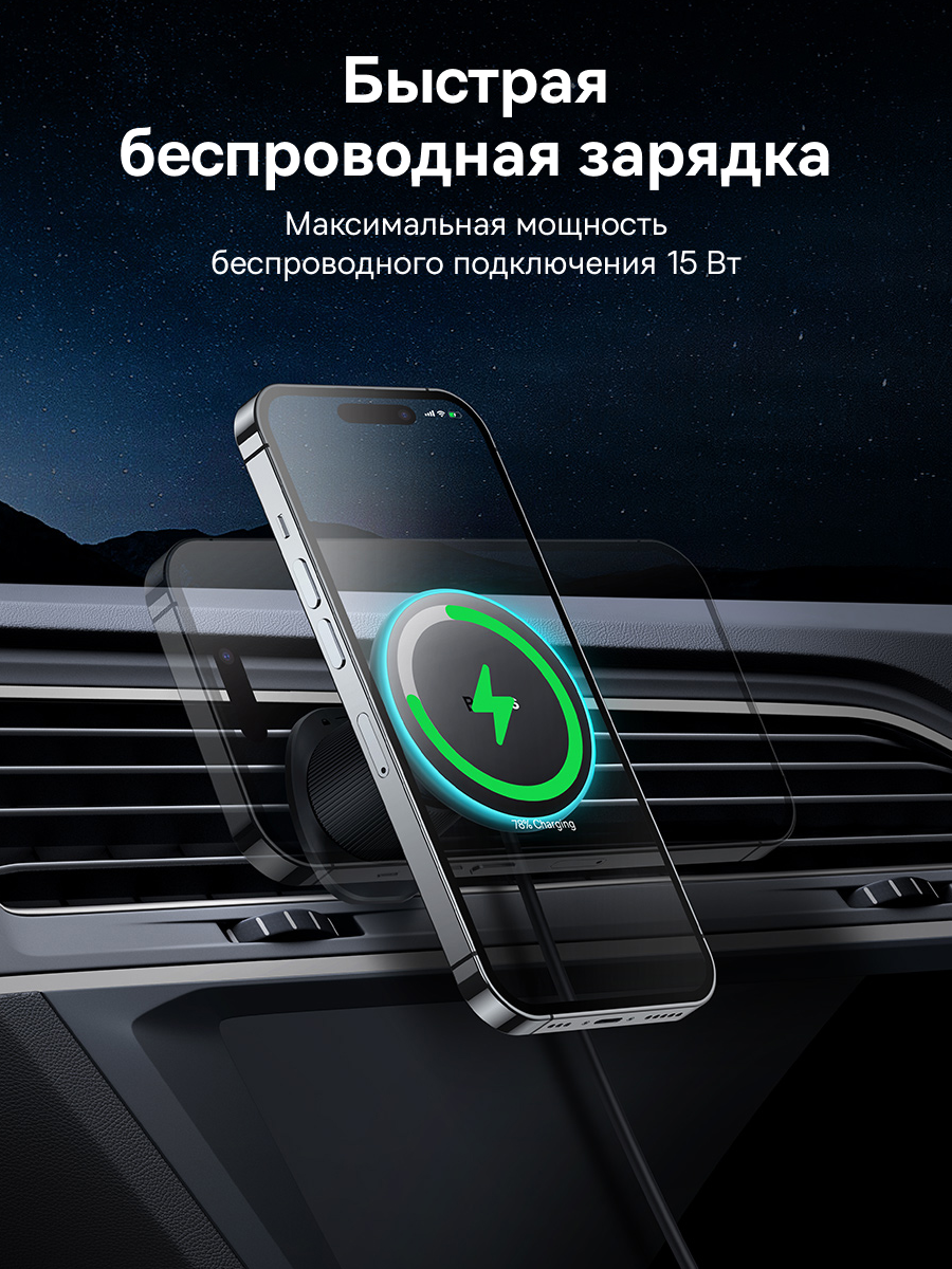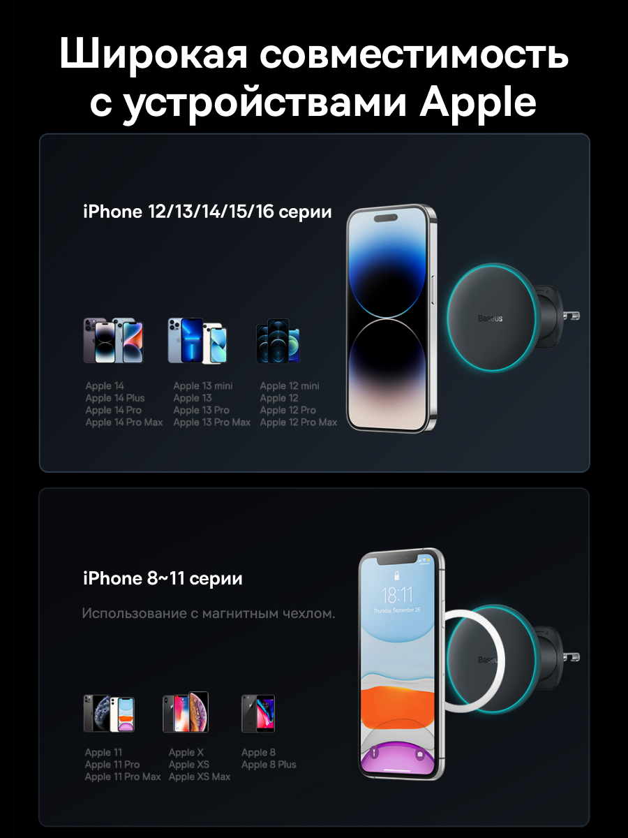 Держатель Baseus CW01 с функцией MagSafe и индуктивной зарядкой. Непосредственным выдающимся преимуществом является полное отсутствие фиксаторов и гравитационных механизмов . Можно установить на вентиляционную решетку.