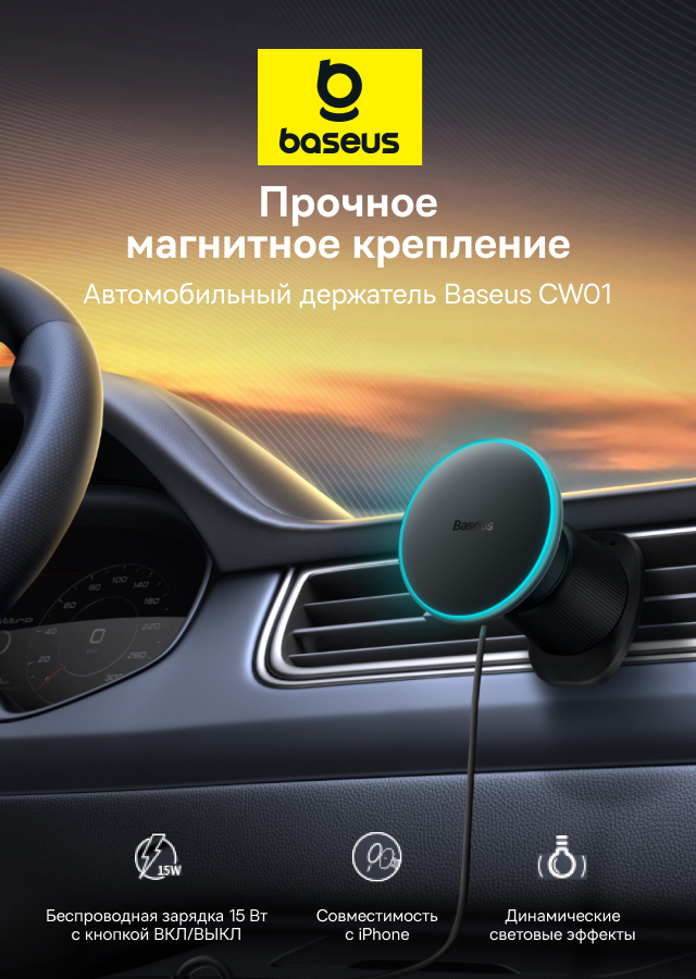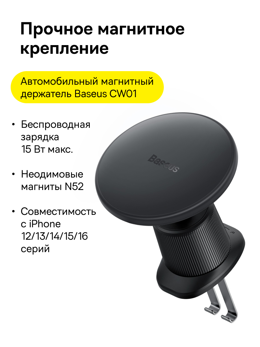 Держатель Baseus CW01 с функцией MagSafe и индуктивной зарядкой. Непосредственным выдающимся преимуществом является полное отсутствие фиксаторов и гравитационных механизмов . Можно установить на вентиляционную решетку.