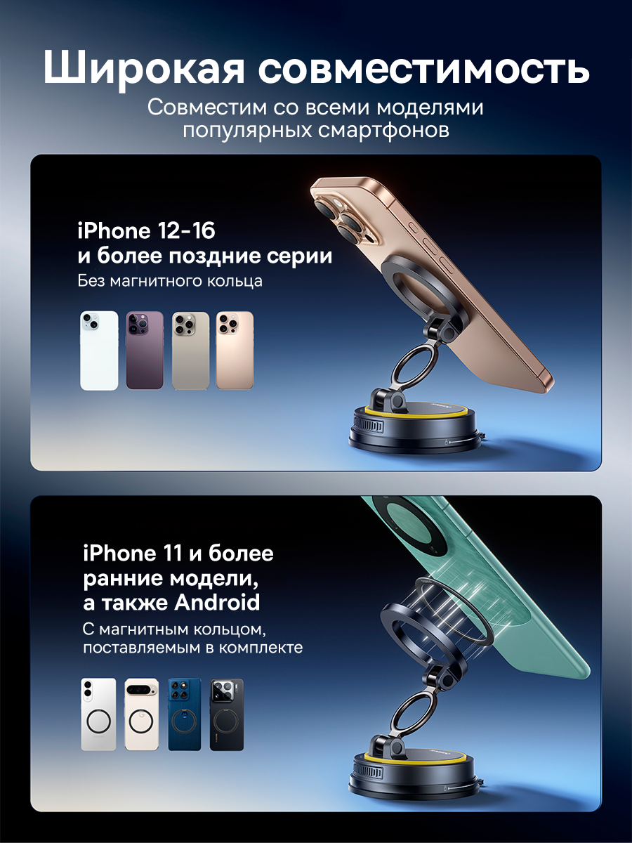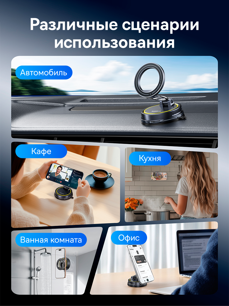 3-осевой гибкий рычаг + 360° шарнир для точной настройки угла; Рабочая температура −20°C … 85°C; В комплекте металлическая пластина и клейкая пластина для немагнитных чехлов |