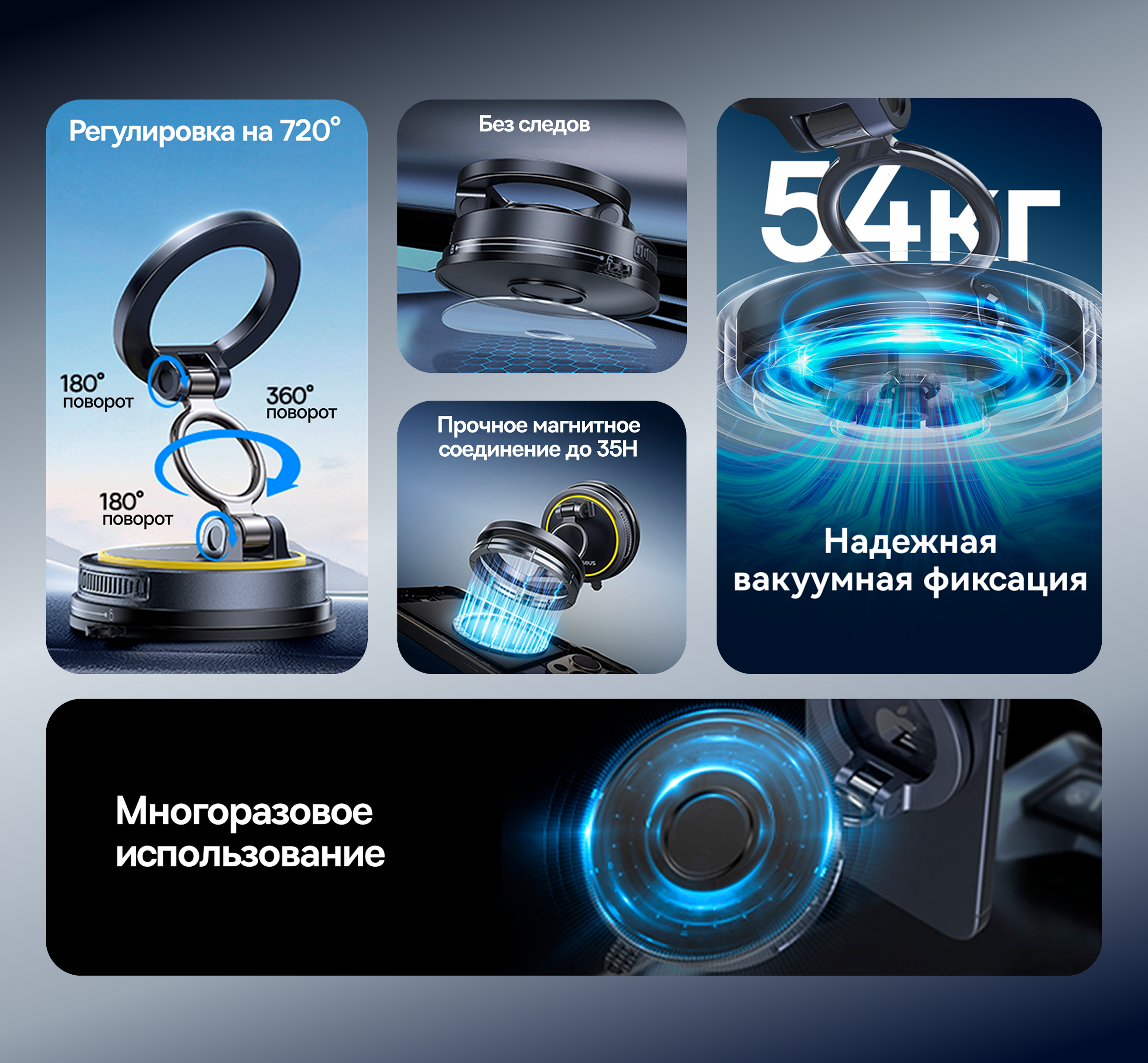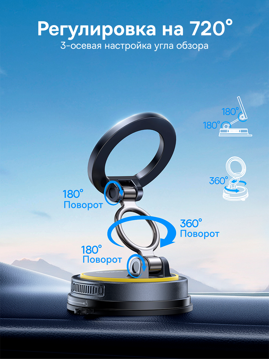 3-осевой гибкий рычаг + 360° шарнир для точной настройки угла; Рабочая температура −20°C … 85°C; В комплекте металлическая пластина и клейкая пластина для немагнитных чехлов |
