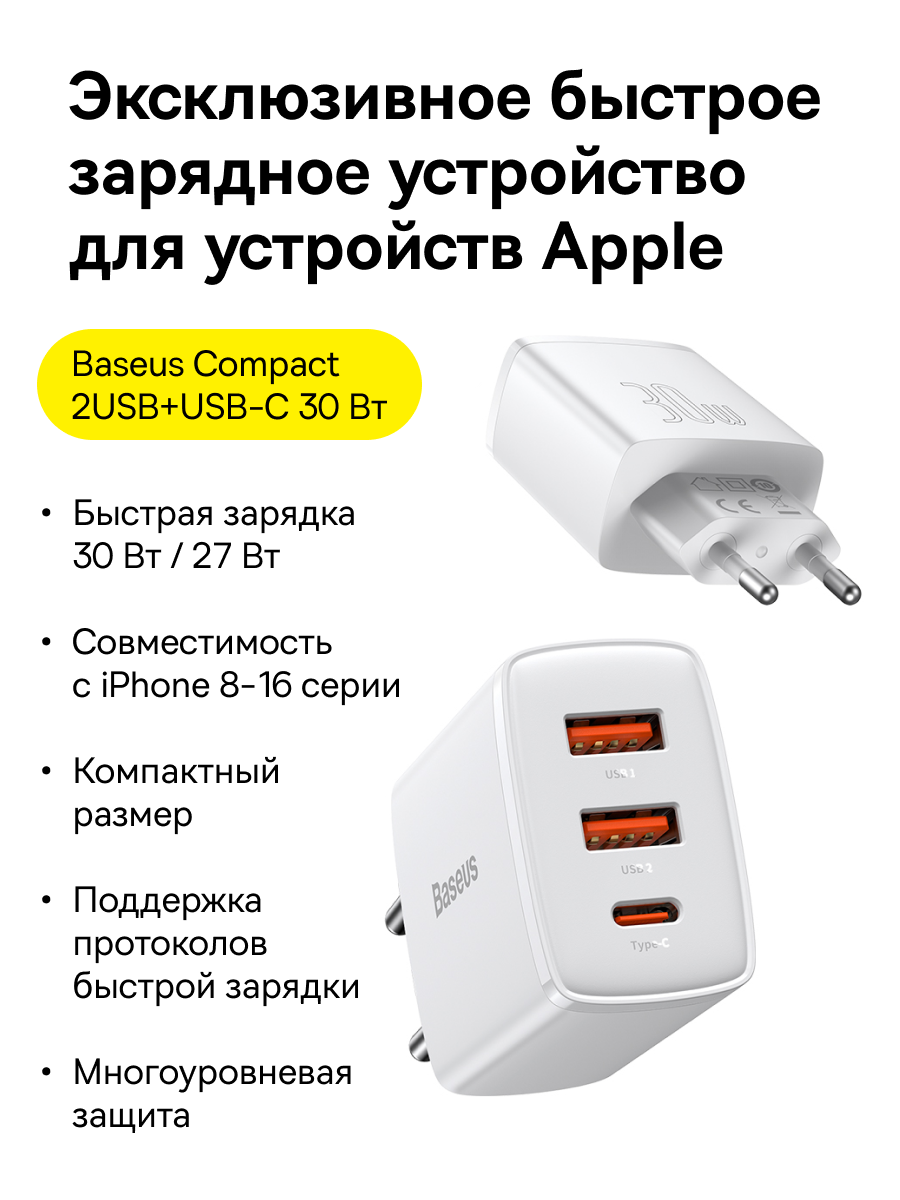 1x Зарядное устройство Baseus Compact Quick Charger 2U+C 30W