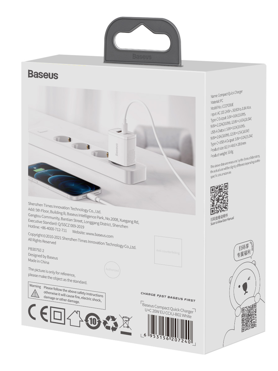 1x Зарядное устройство Baseus Compact Quick Charger U+C 20W