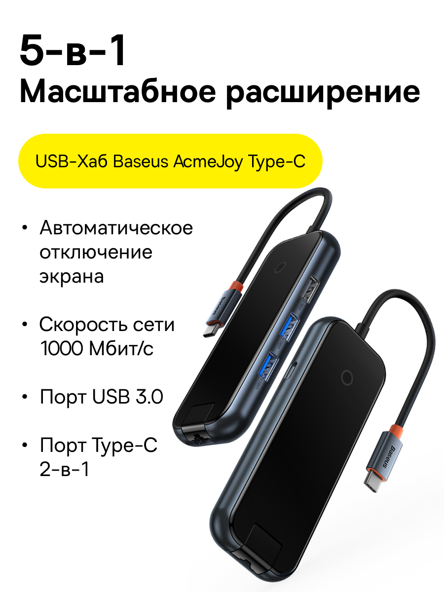 Концентратор Baseus AcmeJoy 5 в 1 предлагает 5 полезных портов — 2x USB 3.0, USB 2.0, USB-C и RJ45. Он обеспечивает скорость передачи файлов до 500 МБ/с и поддерживает быструю зарядку PD 100 Вт. Это также обеспечивает бесперебойный доступ в Интернет. Устройство также обеспечивает безопасное использование и отличается широкой совместимостью. Широкая совместимость Каким бы устройством вы ни пользовались — хаб Baseus AcmeJoy вас не подведет!
