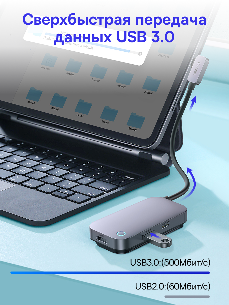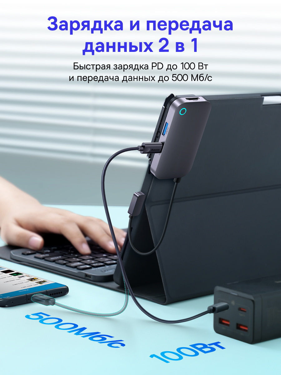 USB-хаб Baseus PadJoy 6-Port Type-C HUB Adapter - это устройство, которое позволяет подключить к компьютеру или ноутбуку до 6 периферийных устройств через разъемы USB Type-C и USB 3.0.