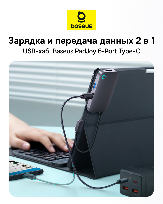 USB-хаб Baseus PadJoy 6-Port Type-C HUB Adapter - это устройство, которое позволяет подключить к компьютеру или ноутбуку до 6 периферийных устройств через разъемы USB Type-C и USB 3.0.