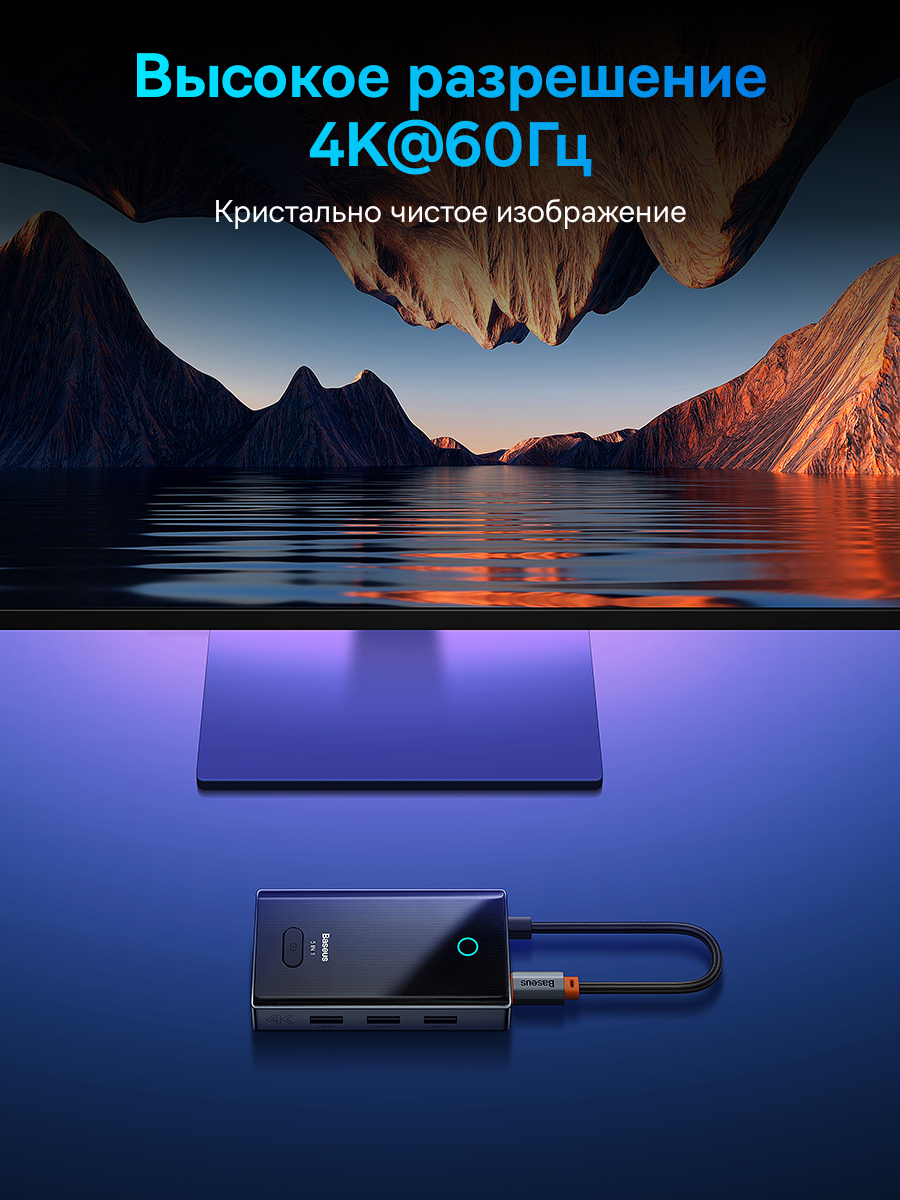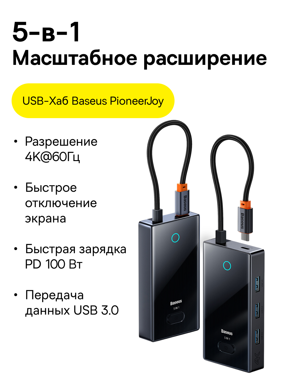 1x Хаб Baseus PioneerJoy 5-Port Type-C HUB Adapter (Type-C - HDMI4K@60Hz*1+USB3.0*3+PD*1)
