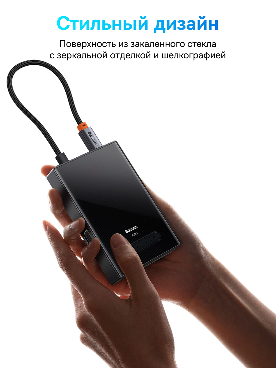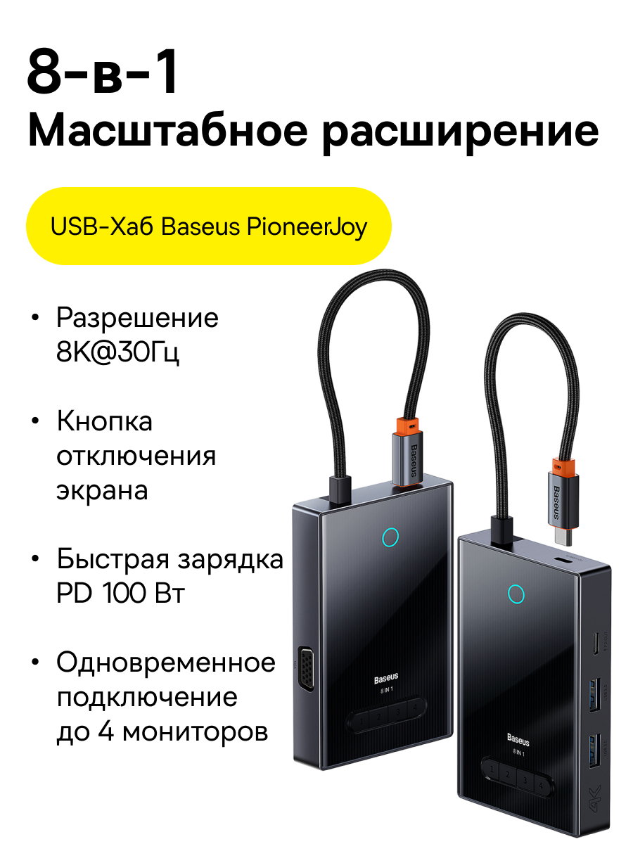 1x USB-C Хаб Baseus PioneerJoy 8-Port Four-Screen Type-C HUB Adapter (Type-C to HDMI4K@60Hz*1+HDMI4K@30Hz*1+DP8K@30Hz*1+VGA+USB3.0*2+Type-C(Data+PDout)*1+PD*1)
