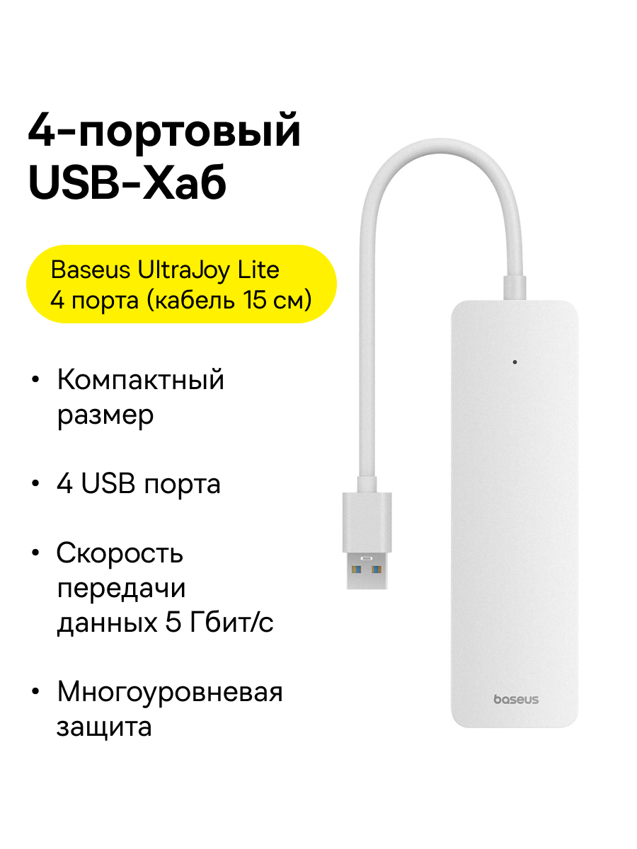 Baseus UltraJoy Series Lite 4-Port 15см (USB - USB3.0*4) Hub - это устройство, которое объединяет в себе компактный дизайн, высокую производительность и надежность. Он является идеальным решением для всех, кто ищет качественный и портативный USB хаб, способный удовлетворить все требования по расширению подключений. Хаб UltraJoy Series Lite предлагает невероятно высокие скорости передачи данных до 5 Гбит/с через четыре независимых порта USB-A 3.0. Это позволяет вам передавать гигабайты данных всего за несколько секунд, что значительно улучшает работу с крупными файлами.