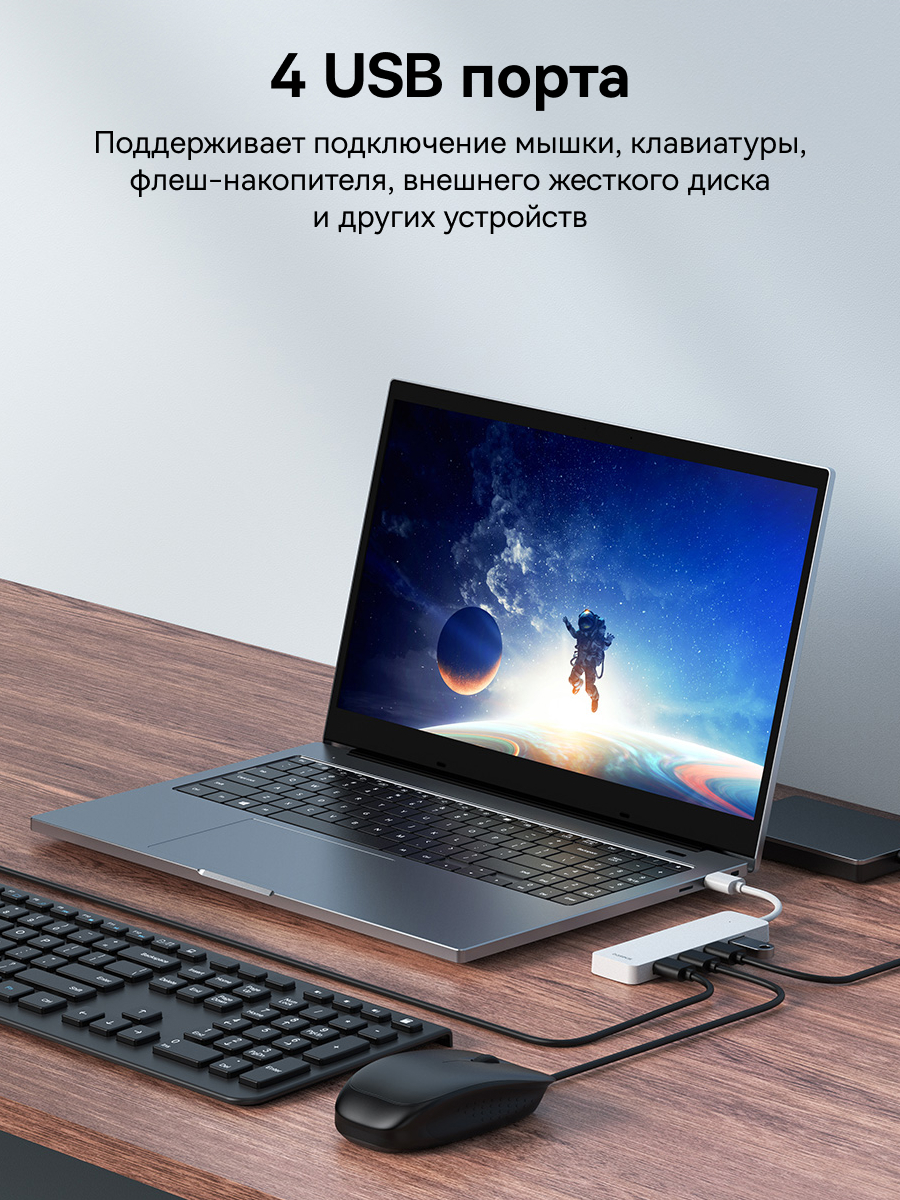 1x Хаб Baseus UltraJoy Series 4-Port HUB Lite провод 15см
