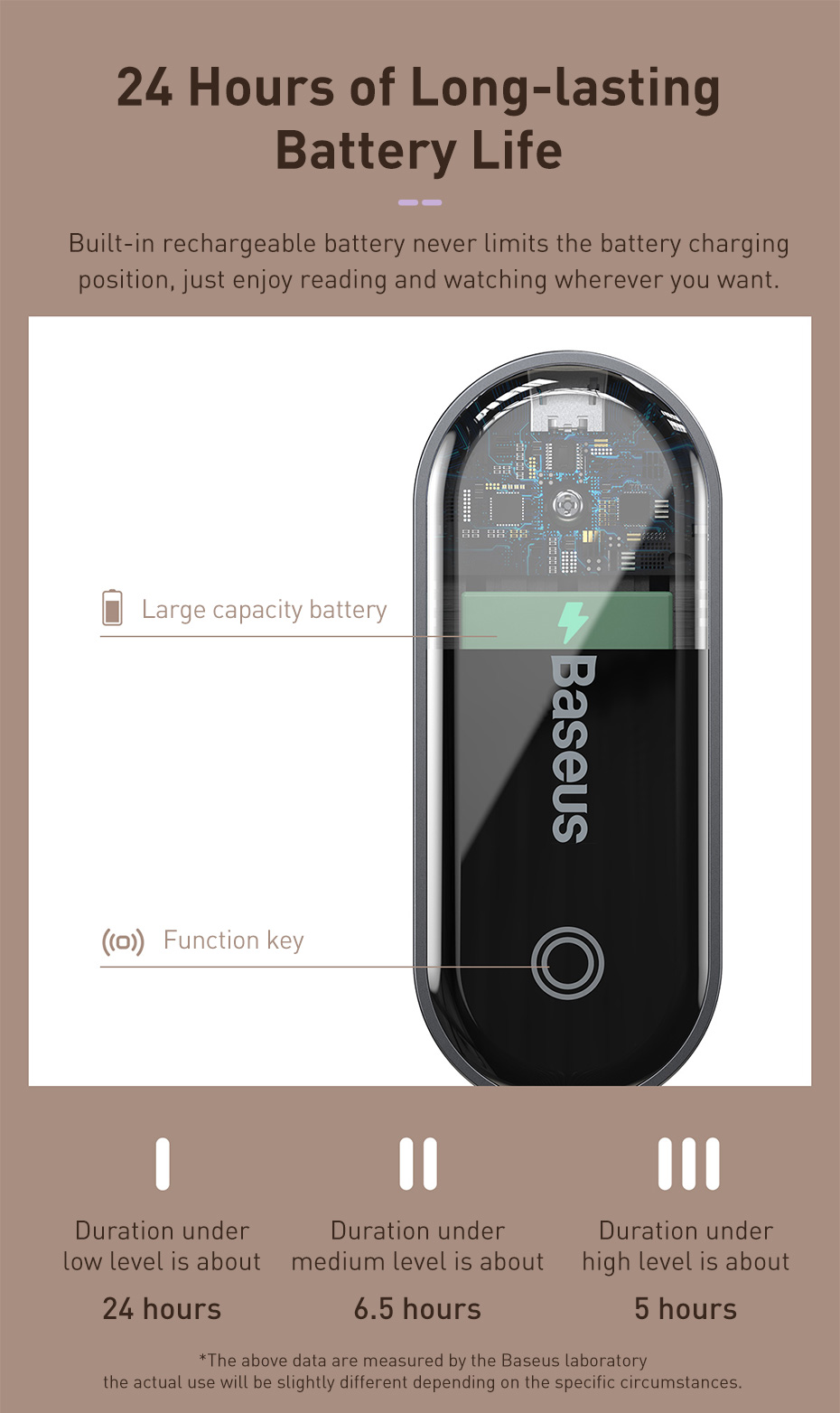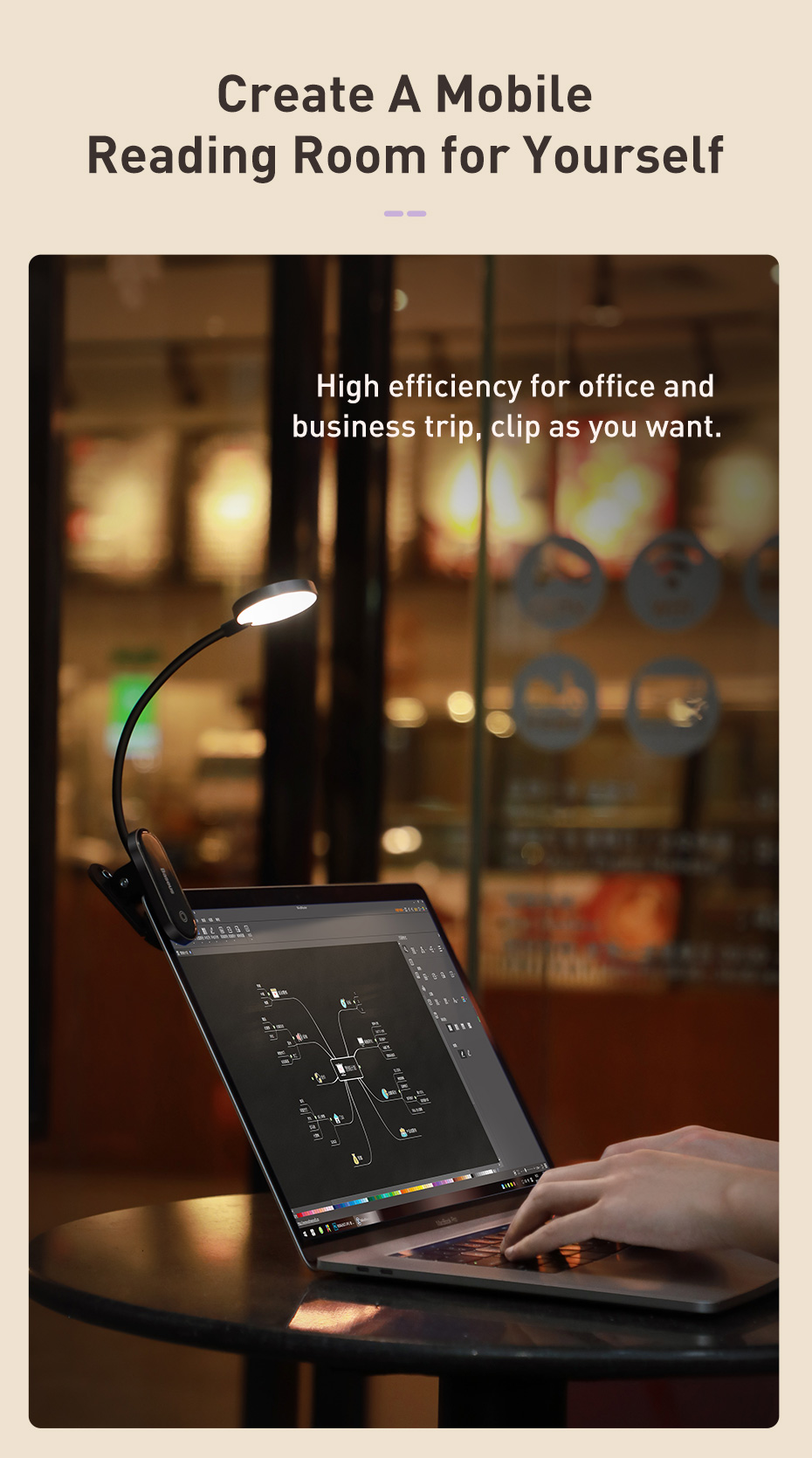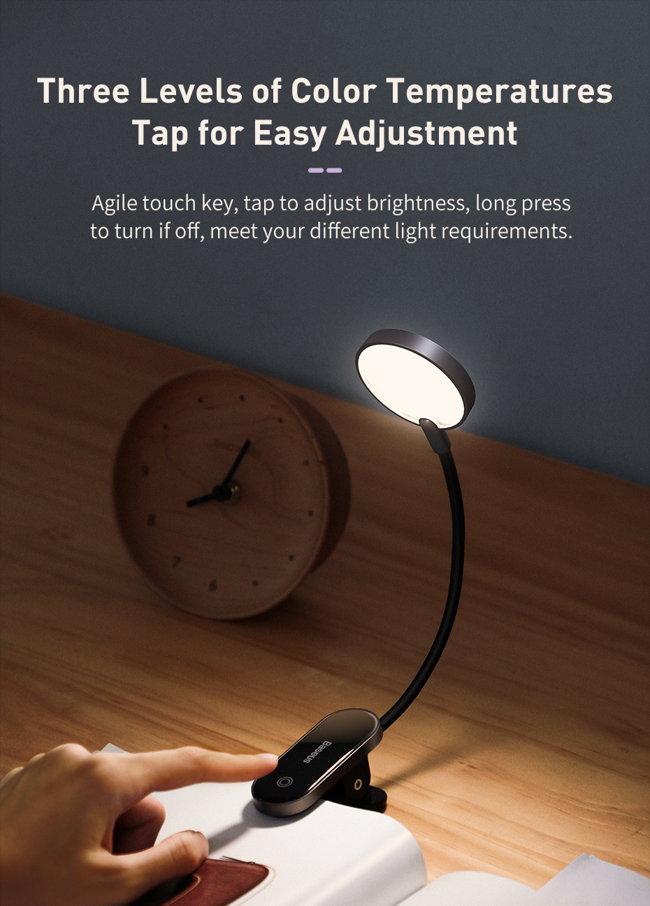Лампа Baseus Comfort Reading Mini Clip Lamp легко подстроится под ваши потребности и станет для вас надежным источником света во время работы и досуга. Ее можно поставить на стол, либо закрепить на тумбочке. Гибкая конструкция позволяет направлять свет от нее именно в ту сторону, которую необходимо осветить. Предусмотрено три режима с разным уровнем яркости: для чтения, работы и отдыха. Лампа не нанесет вреда вашим глазам и проста в использовании. Работает она от встроенного аккумулятора до 24 часов подряд. Благодаря компактным габаритам и малому весу, ее удобно брать повсюду с собой: она не займет много места в вашей сумке и не утяжелит ее.