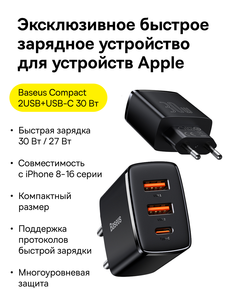 1x Зарядное устройство Baseus Compact Quick Charger 2U+C 30W