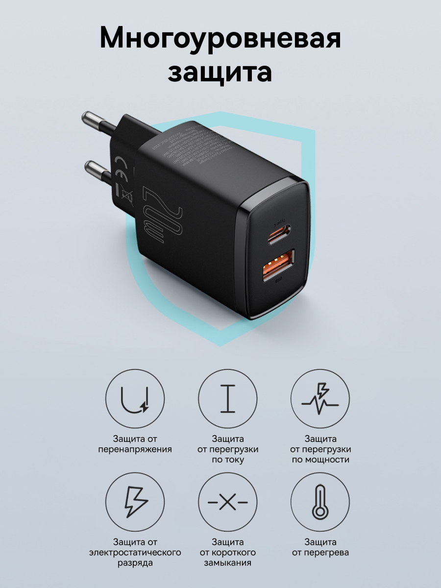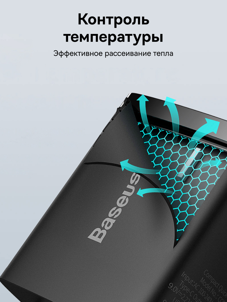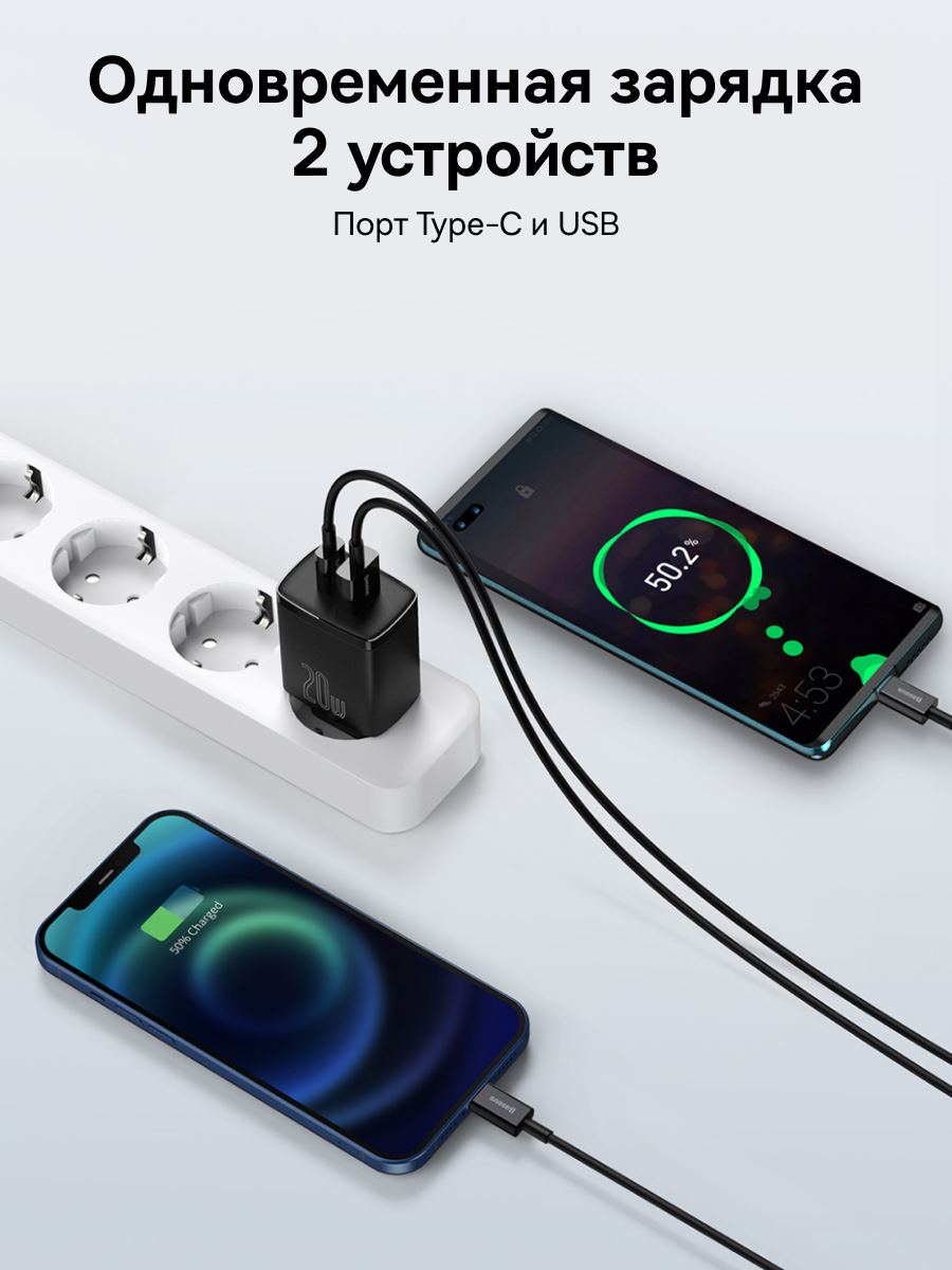 Сетевое зарядное устройство Baseus Compact 20W оснащен двумя разъемами: USB и USB Type-C и благодаря поддержке самых распространенных стандартов быстрой зарядки: Power Delivery, Quick Charger 3.0 и других, будет заряжать совместимые модели гаджетов в разы быстрее обычного адаптера питания. Корпус его выполнен из поликарбоната, отличающегося высокой термостойкостью, что позволяет постоянно поддерживать нормальную рабочую температуру зарядного устройства.