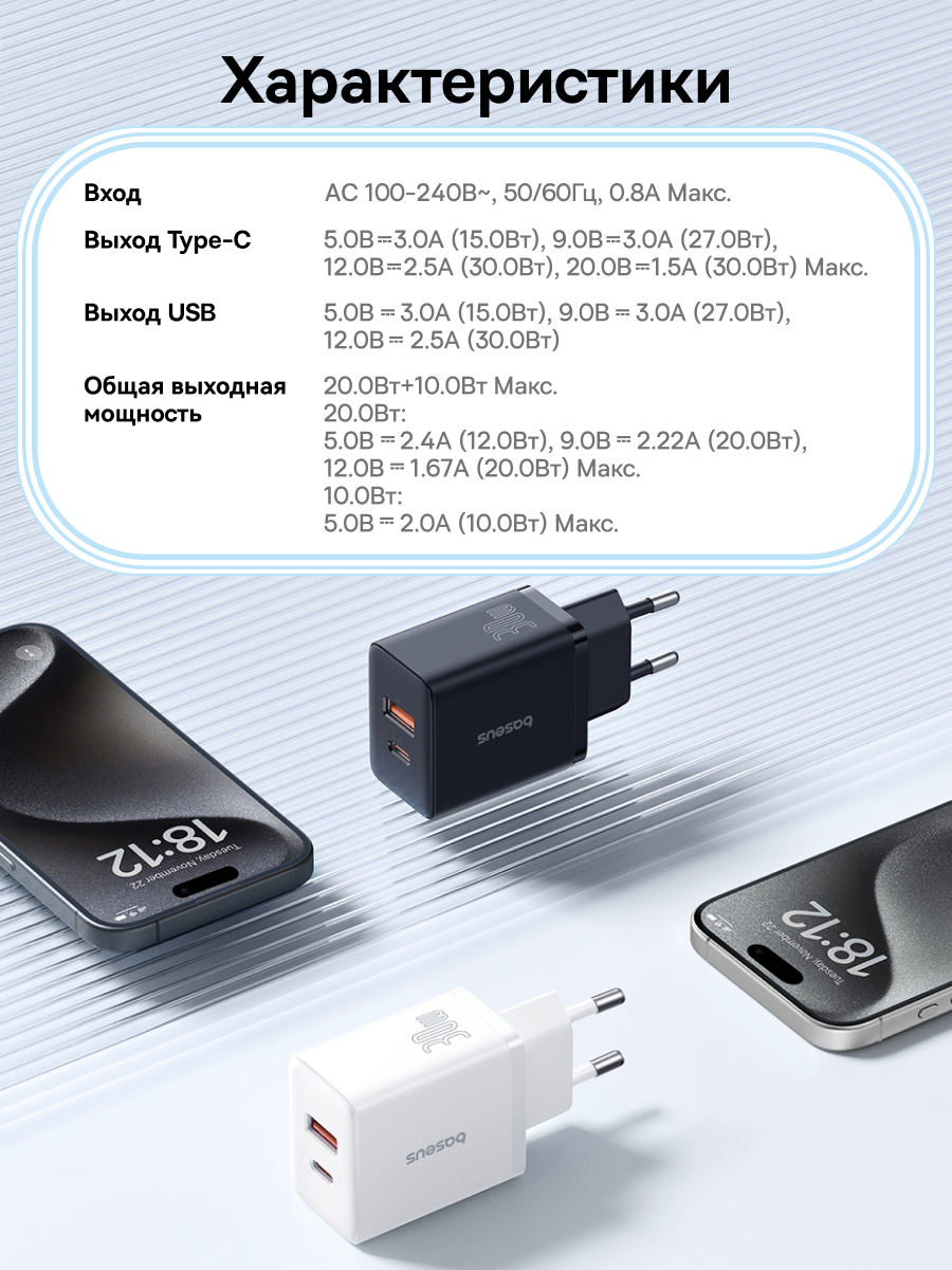 Выход | Использование только одного порта: USB-C: 30W Max, 5V/3A, 9V/3A, 12V/2.5A, 20V/1.5A USB-A: 30W Max, 5V/3A, 9V/3A, 12V/2.5A Одновременное использование двух портов: USB-C + USB-A: 20W+10W |