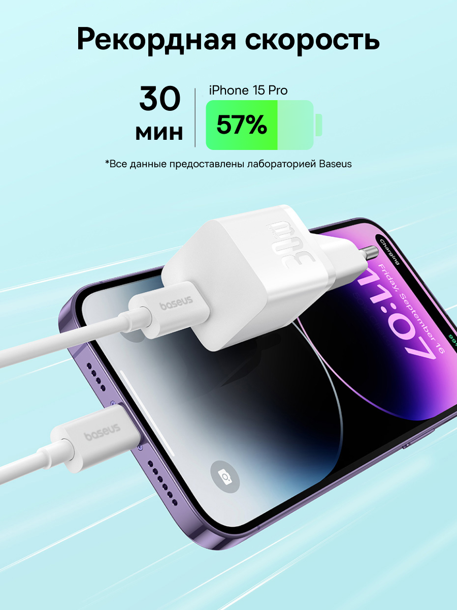С этим зарядным устройством вы сможете быстро зарядить ваш iPhone 15 Pro до 57% всего за 30 минут. Не упустите возможность приобрести надёжное и компактное зарядное устройство Baseus GaN5 (mini) 1C на 30 Вт. Оно станет незаменимым помощником в повседневной жизни и позволит быстро заряжать ваши устройства.
