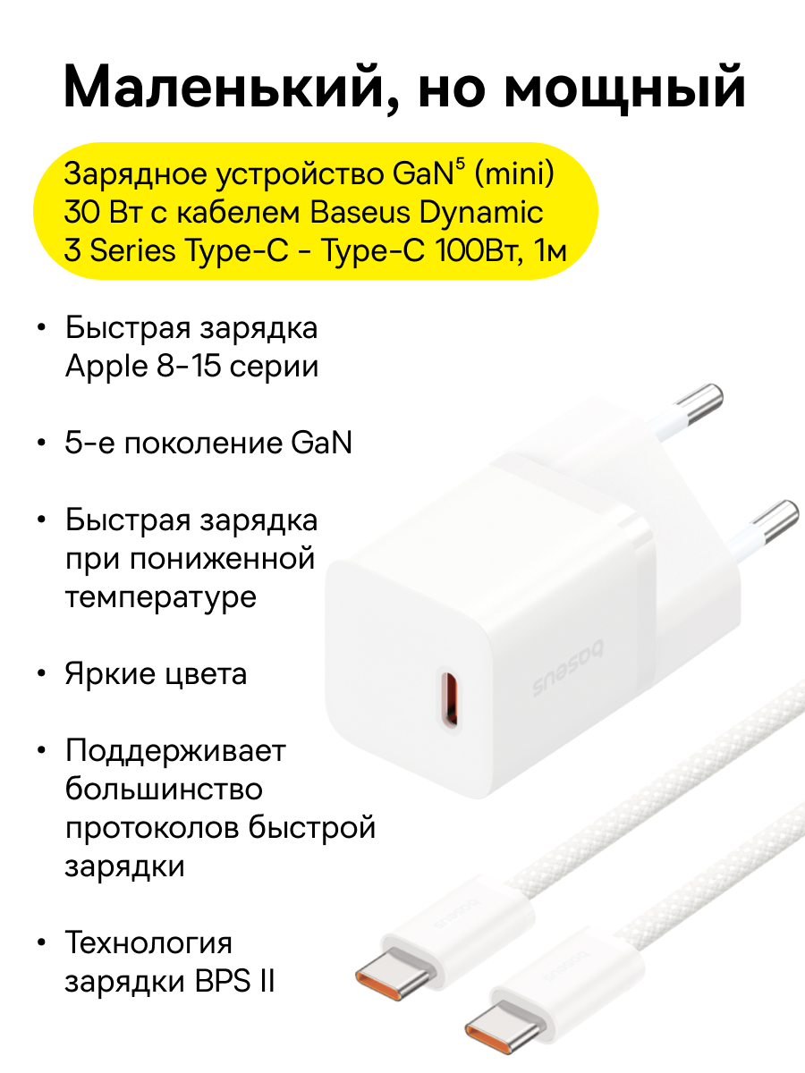—Сетевое зарядное устройство Baseus GaN5 (mini) 1C 30W + Кабель USB-C - USB-C Белый (P10110902213-00)