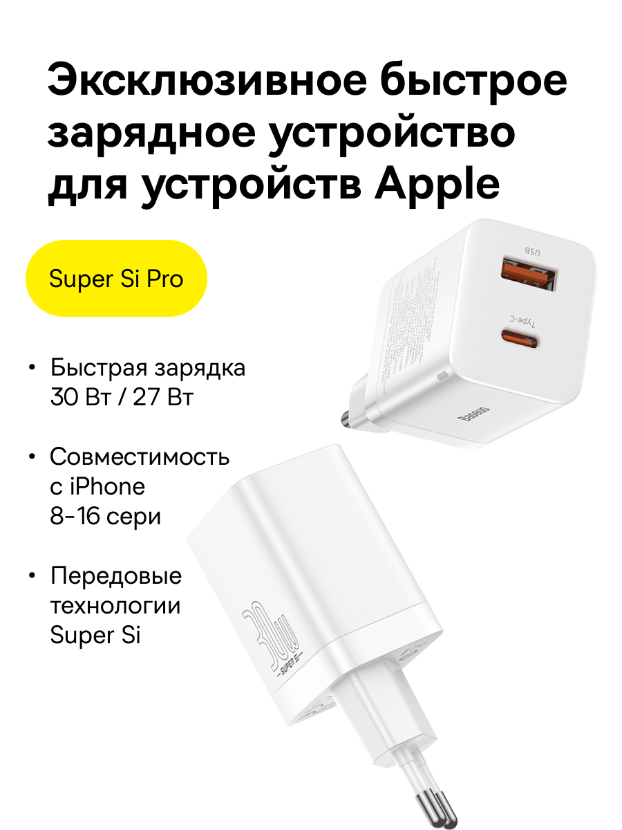 Материал, из которого изготовлен аксессуар, отличается высокой плотностью, хорошей теплопроводностью и эффективным преобразованием энергии. Технология Super Si приводит к уменьшению габаритов зарядного устройства и обеспечивает более быструю и безопасную зарядку. Кроме того, смарт-чип реагирует на контроль температуры.
